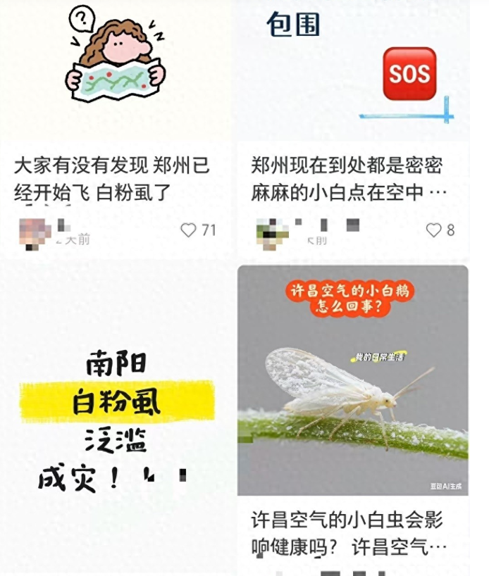 “早上一下楼,白花花的一片,根本不敢张嘴说话,一不小心就飞进嘴里。”一位郑州居民无奈地说。这种被称作“白粉虱”的小虫虽只有一两毫米大,但数量极多,成群飞舞时宛如雾霾弥漫,又似微型暴风雪席卷街道。