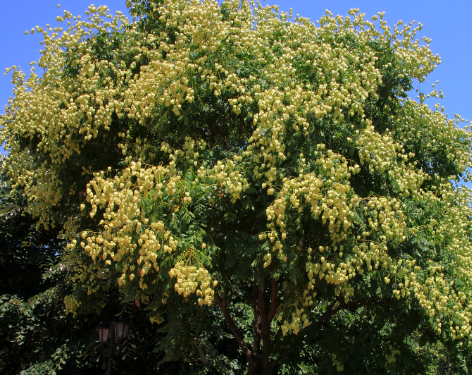 先是细碎的金黄色小花簇拥在枝头,秋风一过,便簌簌落下,如同一场安静又奢侈的黄金雨。