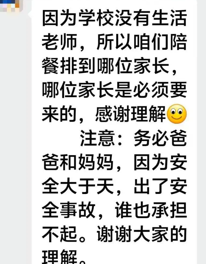 开学伊始,城西小学四年级的班级群里发布通知:​​孩子在校午餐需以家长陪餐为前提​​。陪餐时间为中午11:40至14:30,职责包括打饭、打汤、看护午休等,且明确要求必须由父母参与。