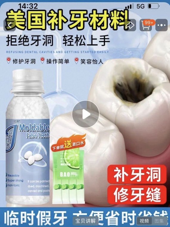 “30分钟在家拯救蛀牙”“补完啃骨头”“当天补牙洞,3天告别蛀牙”——这些充满诱惑力的宣传语在电商平台上层出不穷。新京报记者调查发现,一款售价27.99元、已售3万+的“魅盈牙科模型材料-树脂”,在商品标题中赫然标注着“永久医用自补填充神器具”,而细看宣传图却有一行小字提醒:“只是临时补牙材料,不可替代牙科医院专业”。 这种自相矛盾的宣传策略成为商家的通用手法。在某社交平台店铺中,一款德国进口临时补牙材料宣称“5年质保不掉落”“通透感媲美真牙”,但客服私下承认“如果牙开始疼的话,不可以使用”。更有甚者,一款号称“专为蛀牙牙洞研发”的产品,竟建议消费者“每天坚持使用”——而专业的临时补牙材料补上后只要不掉落就无需更换。