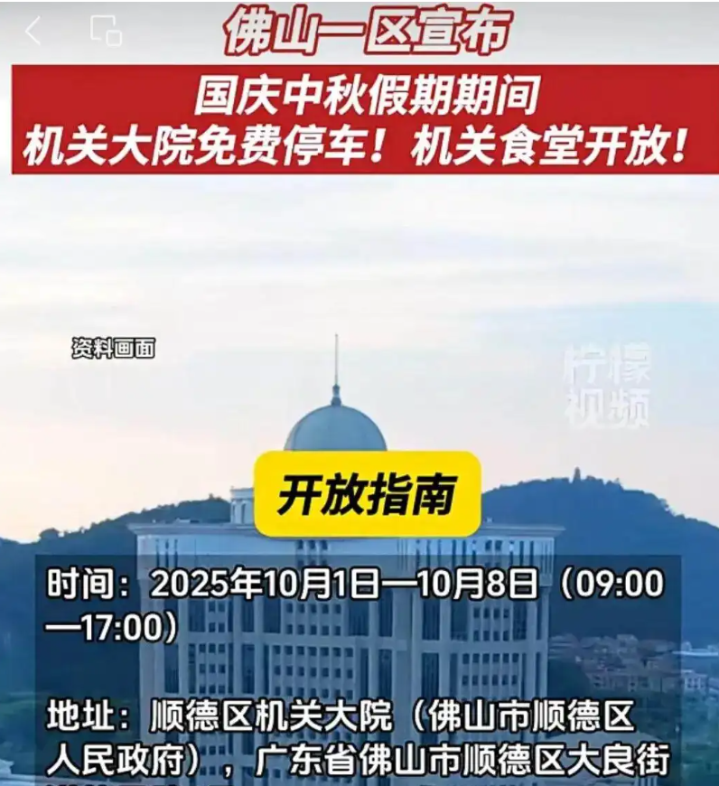 佛山顺德区政府国庆期间开放机关大院停车位与食堂,以实实在在的服务破解旅游难题,展现了服务型政府的开放姿态,这比传统的文旅优惠券更能赢得人心。