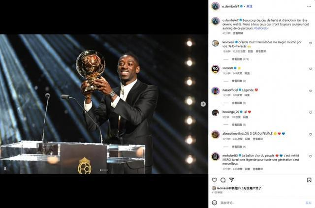 梅西,这位在足球历史上留下无数辉煌印记的球王,已经八次将金球奖揽入怀中,其卓越的球技和对足球运动的深远影响力,早已成为足坛不朽的传奇。当登贝莱斩获金球奖的消息传来,梅西第一时间在社交媒体上点赞并评论了登贝莱的动态,毫不吝啬地向这位昔日的队友送上了最真挚的祝福。梅西写道:“太棒了,奥斯曼(登贝莱)!!!我为你感到非常高兴,你值得拥有(金球)。” 短短几句话,却饱含着梅西对登贝莱的认可与赞赏,字里行间流露出的深厚情谊,让无数球迷为之动容。