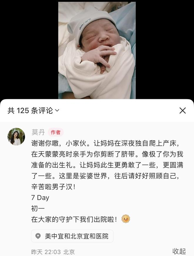 莫丹在社交平台上动情写道:“谢谢你,小家伙。让妈妈在深夜独自爬上产床,在天蒙蒙亮时亲手为你剪下脐带,像极了你为我准备的礼物。让妈妈此生更勇敢一些,更圆满一些,辛苦了男子汉!”字里行间流露出初为人母的喜悦与感动。