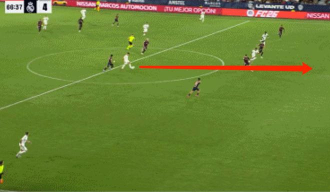 比赛第66分钟,皇马后场断球发动快速反击。中圈附近的居莱尔接球后抬头观察,在高速奔跑中不等皮球落地,直接用右脚外脚背送出一记精妙挑传。皮球划出完美抛物线,精准绕过莱万特整条防线,恰好落在姆巴佩冲刺路线上。法国巨星轻松得球后单刀破门,进球后兴奋地指向居莱尔大笑致意。