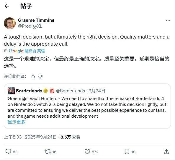 Gearbox Entertainment于2025年9月24日突然宣布,原定于10月3日发售的《无主之地4》Nintendo Switch 2版本将无限期延期。这一消息在玩家社区引发轩然大波,尤其是对那些早已预购游戏的NS2玩家而言。创意总监Graeme Timmins在社交平台上将这一决定描述为”艰难但正确”的选择,强调团队始终将”质量优先”作为核心原则。官方声明中,Gearbox表示延期是为了确保为玩家提供”最佳的游戏体验”,开发团队需要更多时间打磨游戏并解决现有的技术问题。