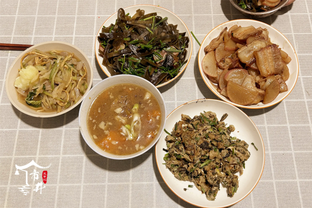 这桌家常便饭,没有山珍海味,甚至有些 “不精致”:肉片切得不均,菜汤少得见底,还有剩菜热了又热。但我们从不挑剔,有啥吃啥,因为知道每一道菜背后都是父母的用心 —— 冻香椿是春天的储备,厚海带是跑遍市场找来的,炖羊肉是父亲花一下午慢炖的,剩菜不浪费是老一辈的持家习惯。